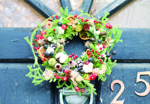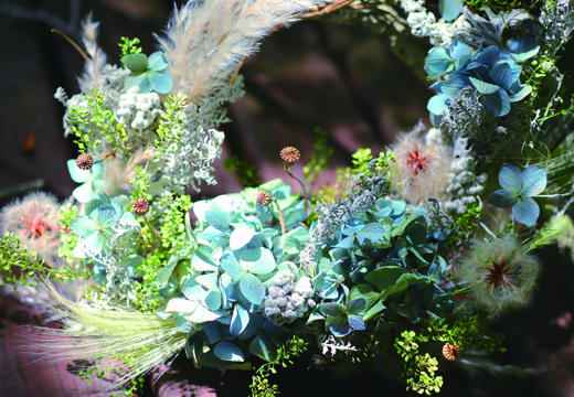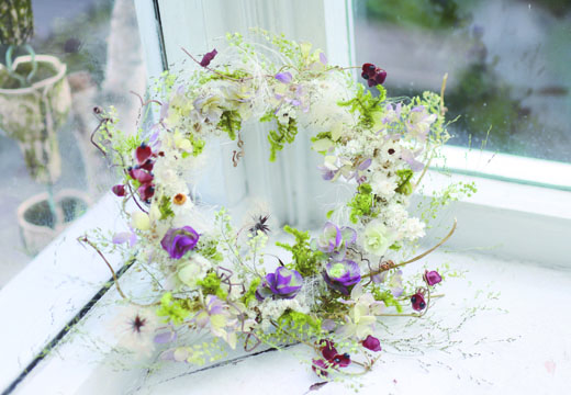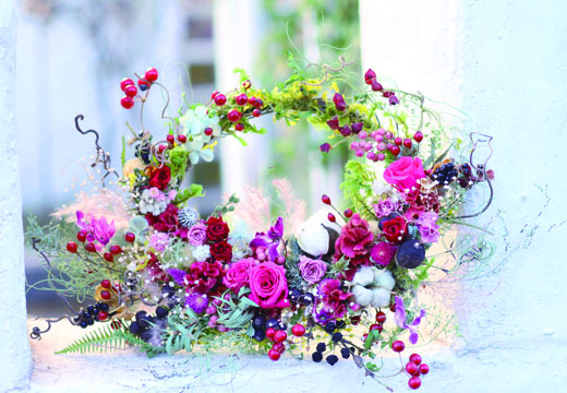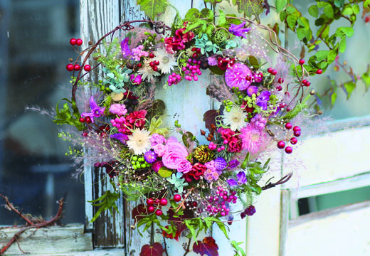 野の草花や実、枝、蔓などを主な花材にして、野のイメージのリースを作っています。